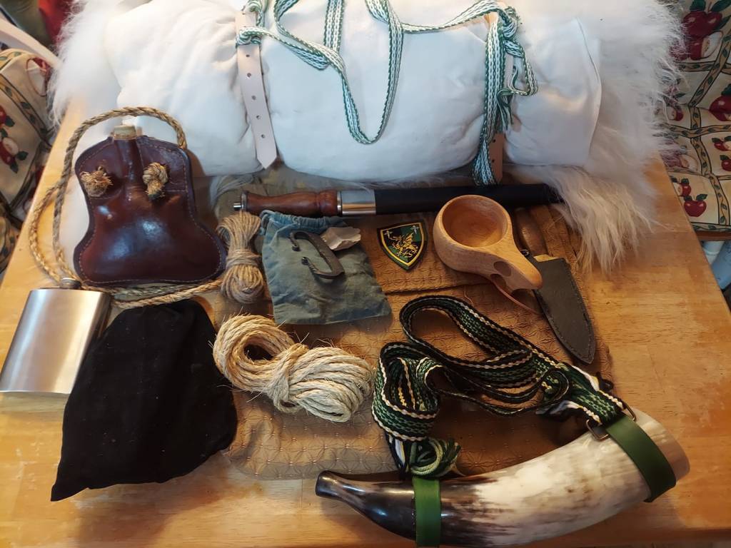 My kit pictured above is my first iteration and will be constantly improving. The bedroll is a wool blanket with a sheepskin on the outside. The woven belt ties onto the leather straps and when not slung over the back the belt is used for lashing camp poles or hanging items at camp. The leather flacket is based off a Mary Rose find and ropes are natural fiber, good for putting up a shelter or even fire starter if needed. Flint and steel in a beeswax coated pouch, wooden cup for oatmeal and drinks. The longer knife is my Dirk which works for self defense, chopping wood and cutting rope. The smaller knife goes into the messenger bag seen below these items and is used for food, carving and any assortment of smaller tasks. The hunting horn has leather straps and the Forester belt used as the shoulder strap. I usually carry a little brandy for those cold nights in the (non period) flask but inside the black bag is my modern cheat of a water purifying pump. Not shown here is the oak staff I made for walking, self defense and tent pole. I also carry a 9′ X 12′ 10oz. canvass wrapped around the bedroll.