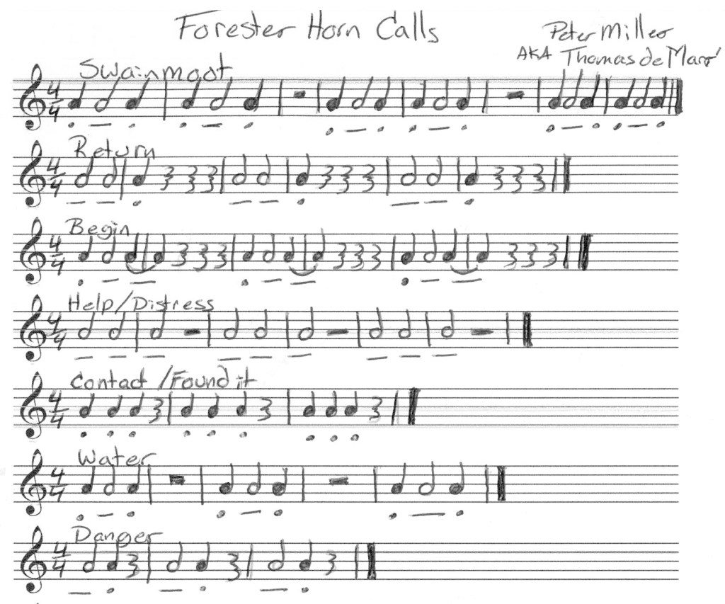 Forester Horn Calls – To develop horn calls for the Forester Guild I needed to determine what types of calls were needed or useful to have in the field. Guild activities center around hiking, camping, canoeing and land management so these are the activities I looked at for potential communication needs. A Swainmoot is the gathering or court of the Foresters Guild which needs a call to order or call to meeting. Return is a signal to return to camp or meeting place. This will help bring in or recall Foresters who may be out in the field looking for something or working on a task. Begin is the opposite and can mean anything from start walking after a break or start a challenge. Help or distress is the most important call we need to use. Human nature seems to always be to blow three long notes when calling for help, so I decided to use that instead of fight it. When adrenaline is high we act on instinct and this will play into that tendency. Contact or found it covers anything from found what was being searched for, or contact made with creature, person or item of interest. Water is just as important. Finding a source of drinking water is always critical when in nature but also refers to landmarks used for navigation like rivers, streams or ponds. Last but not least is the signal for danger. It’s a heads up, pay attention, somethings not right, we need to pay attention. The call covers situations like fire, inclement weather, landslides, floods, dangerous animals or even people.